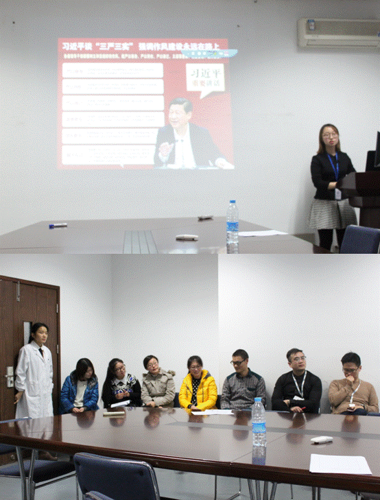 研究生党支部书记金雪潇同学主持会议,首先介绍了“三严三实”的具体内容:“既严以修身、严以用权、严以律己,又谋事要实、创业要实、做人要实”。“三严三实”既是正心修身的思想守则,也是科学研究的行动准则,是党的群众路线教育实践活动的继续和深入,对加强党风廉政建设、规范各级党员干部的言行、以扎实有效的工作作风推进医疗科学事业发展具有重大意义。接着,金雪潇同学组织大家讨论对“三严三实”活动的学习感想和体会。有些同学表示我们应该牢固树立“三严三实”的学习态度和科研作风,为群众同学树立标杆和榜样;有些同学认为应该及时反思目前学习和科研中还存在哪些不足,及时改正,逐步提升,真正做到严于律己。