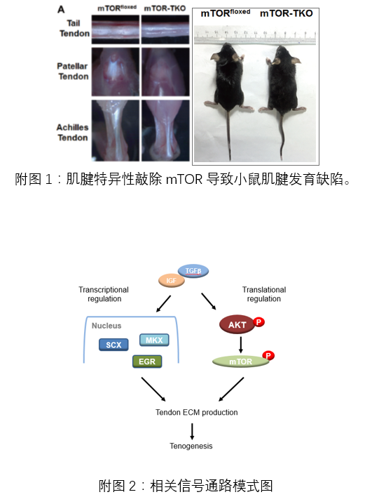 肌腱是运动系统的重要组成部分,其主要成分是I型胶原为标志的细胞外基质。运动损伤导致的肌腱撕裂,以及年老退化或过度使用导致的肌腱炎都是骨科常见的疾病。但目前对调控肌腱分化发育的分子机制的理解不够深入,导致有效治疗手段的相对缺乏。目前相关研究集中于肌腱分化的重要基因在转录水平的调控,而在蛋白质翻译水平调控肌腱分化的关键信号通路尚不清楚。本研究首次发现AKT-mTOR 信号通路在间充质干细胞向肌腱分化过程中被激活,进一步研究表明mTOR蛋白在肌腱炎中表达显著下调。在体外干扰AKT-mTOR信号通路会降低干细胞向肌腱分化的能力,导致形成的胶原纤维变细。为了在体内验证这一结果,我们和美国Ronen Schweitzer教授(肌腱关键转录因子SCX的发现者)合作构建了首个肌腱特异性mTOR敲除小鼠。发现该小鼠具有肌腱发育分化不良、肌腱力学性能丧失、以及肌腱内胶原纤维变细的表型,但肌腱分化相关基因在转录水平的表达并无差异。