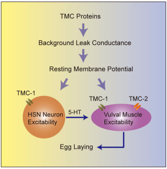 康利军课题组以秀丽隐杆线虫(C. elegans)为模式,发现TMC-1和TMC-2蛋白可通过介导背景Na+电流,维持相关神经元和肌肉细胞的静息膜电位和兴奋性,并调控线虫的产卵行为。
