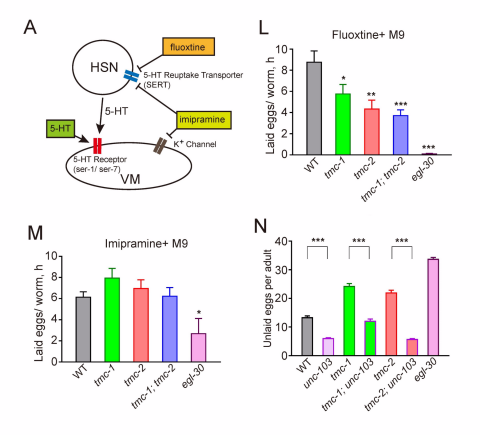 通过构建表达有GCaMP5.0荧光蛋白的转基因品系,以在体胞内钙成像检测,研究人员发现TMC蛋白对于维持卵孔肌肉细胞(VM)和HSN神经元的节律性钙震荡至关重要。而基于ChR2和CoChR转基因的光遗传实验检测,也进一步证明了这一论断。