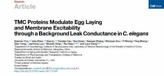 康利军研究组发现,TMC-1在秀丽线虫神经、肌肉系统中广泛表达,而TMC-2特异性表达于肌肉细胞中。 TMC-1和TMC-2的缺失,均会导致秀丽线虫产卵行为缺陷。康利军课题组的研究人员首先想到产卵行为跟机械感受之间可能存在密切的联系,也就是卵到达排卵部位后,可能对相关的神经元和肌肉组织产生挤压作用,而这种挤压力由什么蛋白感受,先前未见报道。