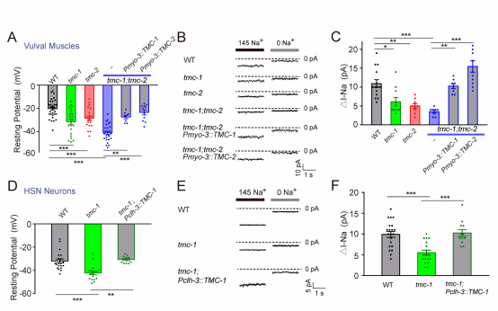 为了进一步探索TMC蛋白调控细胞兴奋性的分子机理,康利军研究组研究人员记录并检测了相关神经元和肌肉细胞的电生理特性。有意思的是,他们发现在tmc突变体中,VM 肌肉细胞、HSN神经元以及ASH神经元的静息电位都明显偏低,细胞处于超极化状态,因此其可兴奋性均显著降低。同时,这些细胞上的背景Na+漏电流(background Na+ leak current)都显著减小(下图)。此外,TMC -1在ASI神经元(头部感觉神经元)上的异位表达,则能显著加大其背景Na+电流,并提升细胞的静息膜电位,增强其可兴奋性。