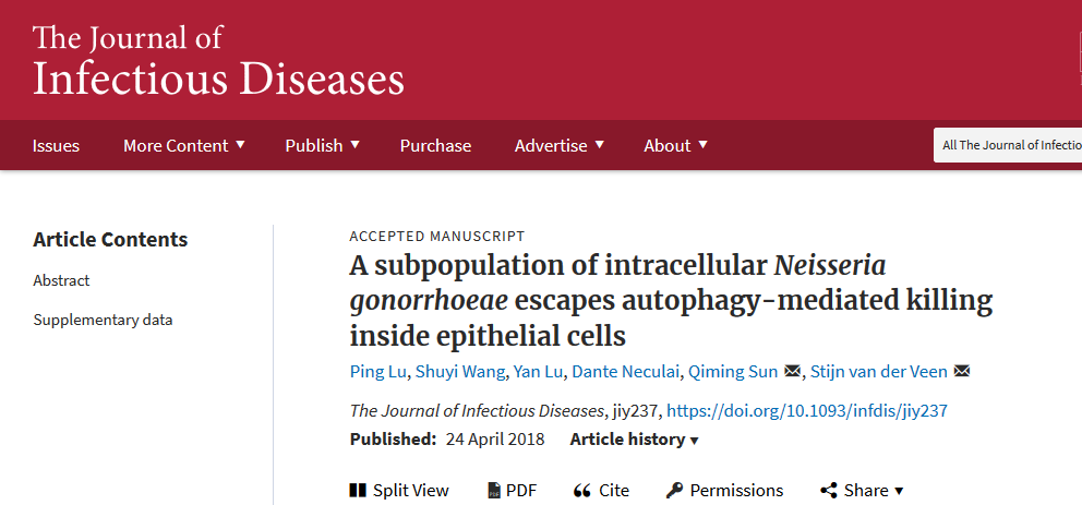 4月24日,437bwin必赢国际官网Stijn van der Veen课题组在Journal of Infectious Disease上在线发表封面论文“A subpopulation of intracellular Neisseria gonorrhoeae escapes autophagy-mediated killing inside epithelial cells”,探究了淋球菌与上皮细胞自噬之间的具体相互作用,阐释了侵染早期阶段自噬被激活并能够靶向淋球菌的机制和淋球菌在侵染上皮细胞后期能够逃避自噬介导的杀伤作用的机制。437bwin必赢国际官网病原生物学与微生物学系博士后路平为该论文的第一作者。437bwin必赢国际官网病原生物学与微生物学系Stijn van der Veen教授和437bwin必赢国际官网生物化学系孙启明教授为本论文的共同通讯作者。