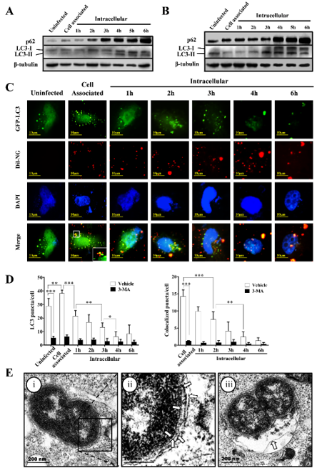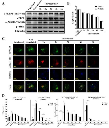 课题组研究发现,在上皮细胞侵染的早期,淋球菌即可被自噬途径靶向识别并被隔离形成双层膜的自噬体。这些早期包含淋球菌的自噬体随后能够与溶酶体融合,从而在随后形成的自噬溶酶体中杀死淋球菌。但是,有一小部分胞内淋球菌能够逃避早期自噬介导的杀伤作用;随后淋球菌能够抑制自噬通路,从而使得病原菌能够在胞内存活和向胞外分泌。在淋球菌抑制自噬的过程中,淋球菌将通过激活mTOR复合物1以抑制经典自噬通路。此外,在此阶段淋球菌还可能抑制自噬体成熟及自噬溶酶体的形成。该课题可为利用自噬通路来清除淋球菌感染的新型疗法提供理论指导,或可开发出针对淋球菌这一多重耐药病原体的新型治疗策略。