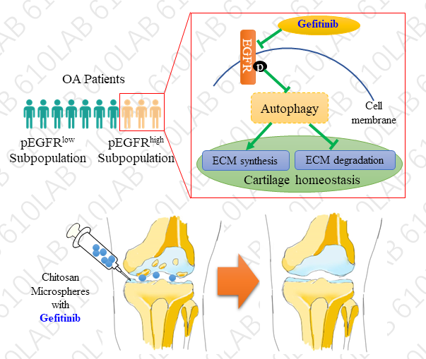 该研究首先通过对59例临床骨关节炎患者的EGFR激活检测,确认了骨关节炎存在EGFR激活的患者亚群;接着,通过构建的Col2a1-creERT2; Egfrf/f小鼠,体内证明了EGFR的激活会抑制软骨细胞的基质合成,促进基质降解酶的表达,导致小鼠骨关节炎的进展;第三步,通过使用美国食品药品监督管理局批准用于治疗非小细胞肺癌的分子靶向药吉非替尼(Gefitinib)干预,结合RNA测序,证明吉非替尼通过抑制EGFR促进软骨基质合成、抑制基质降解,重塑软骨稳态;吉非替尼复合壳聚糖微球缓释系统,可以用于治疗小鼠OA,同时避免吉非替尼这一抗肿瘤药物全身给药所带来的毒副作用;最后,研究者发现了自噬在EGFR调控关节软骨稳态上的重要作用,抑制自噬可以消除吉非替尼对小鼠OA的治疗效果。