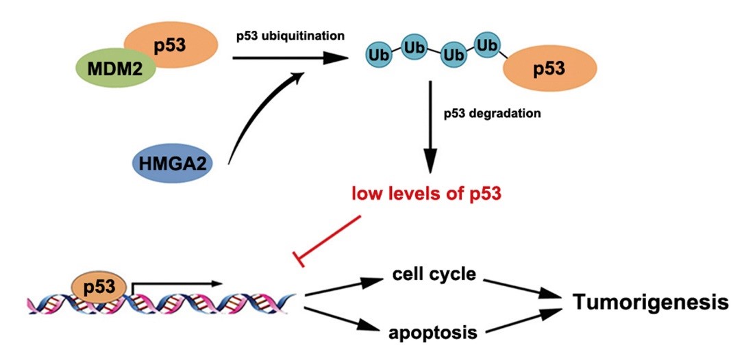 p53蛋白功能的缺失在结直肠癌发生发展中具有十分关键的作用,寻找调控p53蛋白稳定性的相关因子显得十分重要。泛素化修饰是指一个或多个泛素分子在一系列酶的作用下与底物蛋白相互结合,激活蛋白酶体复合物而导致其降解的过程,而泛素化修饰是调控p53 蛋白稳定性的重要机制之一。本研究发现HMGA2蛋白能够与p53及MDM2蛋白直接结合,明确了直接结合的氨基酸序列,揭示了HMGA2通过MDM2 依赖的途径促进p53蛋白的泛素化过程,降低p53的稳定性,参与调控结肠癌细胞周期和凋亡等重要生物学过程。本课题组首次构建并利用肠道特异性Hmga2 KI小鼠,发现Hmga2的条件性敲入能够促进肠道上皮的成瘤过程,并且利用该模型在体内水平对上述分子机制进行了验证,为今后结直肠癌发生发展机制的深入研究提供了新思路。