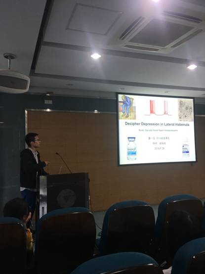 董一言同学首先分享了有关抑郁症的背景知识和治疗现状,接着为同学们详细讲解了他所做实验的实施路线。期间,董一言讲述了自己在科研中碰到的困难以及解决方法,为同学们提供了宝贵的干货经验。他建议同学们要学会和压力做朋友,并且提出克服压力最好的办法就是尽快做出改变;改变中最重要的一点是努力建立和完善知识体系和构架;其次是注重有效的交流。在互动提问环节中,同学们积极发言,董一言也一一做了详尽的解答。