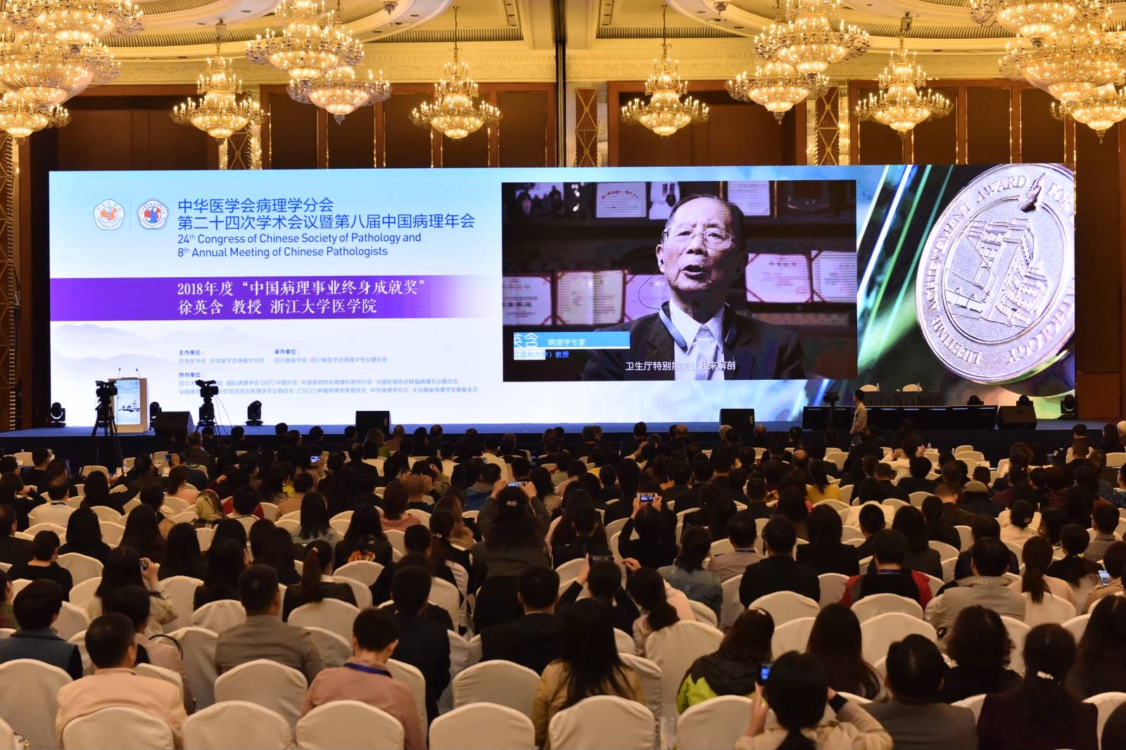 此次徐英含教授以93岁高龄,亲赴成都领奖。颁奖仪式由中国科学院院士,前任病理学会主任委员卞修武教授主持。在接过中华医学会王大方副秘书长颁发的荣誉证书后,徐英含老师动情地回忆起他和成都,和病理的缘分。在五十五年前的十月,他作为参加全国病理学会议的代表,首次来到成都,在大会上宣读了他关于矽肺病理的学术论文。岁月如梭,没想到五十多年后,他作为此次入选的两名终身成就奖获得者之一,再次来到成都与病理年会结缘。