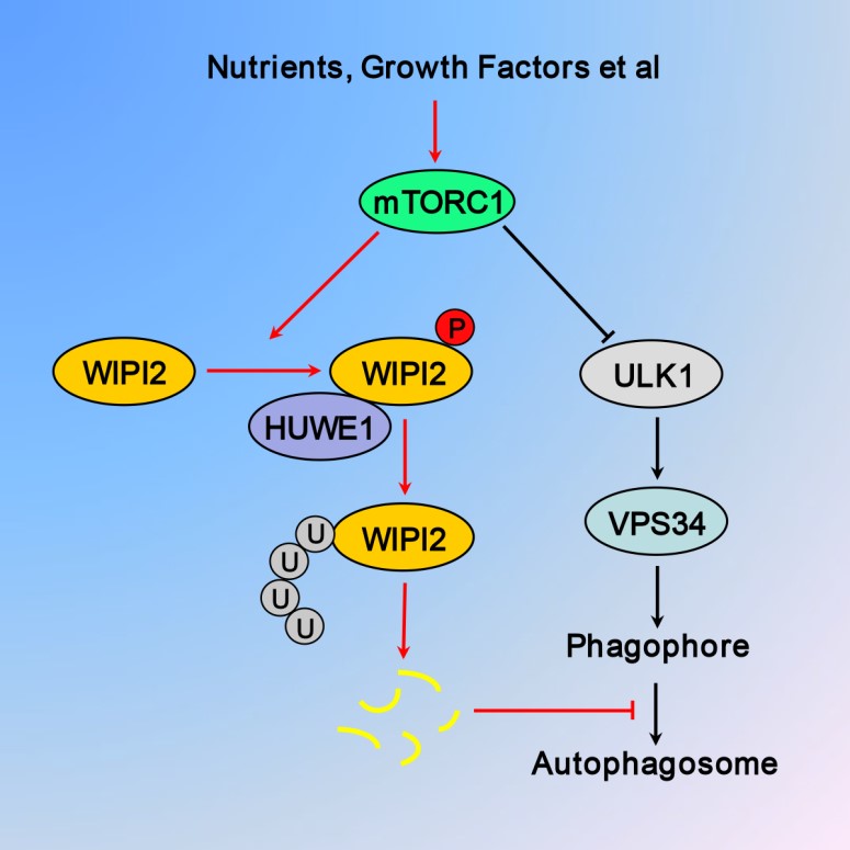 mTORC1作为细胞生长和代谢的master regulator,在自噬过程的许多阶段发挥作用。该研究鉴定出WIPI2是蛋白激酶mTORC1新的磷酸化底物和E3泛素连接酶HUWE1的泛素化底物,发现依赖mTORC1的WIPI2磷酸化在HUWE1介导的WIPI2泛素化降解中的调控作用。该研究不仅证明细胞中WIPI2的蛋白水平是决定基础自噬强度的关键因素和诱导自噬发生的重要调控点,结合mTORC1在自噬起始和自噬体与溶酶体融合以及溶酶体发生中的作用,提示mTORC1涉及对自噬过程每一阶段的控制,从而能响应细胞内外变化迅速启动和终止自噬,进一步体现出mTORC1在自噬调控中主导角色。