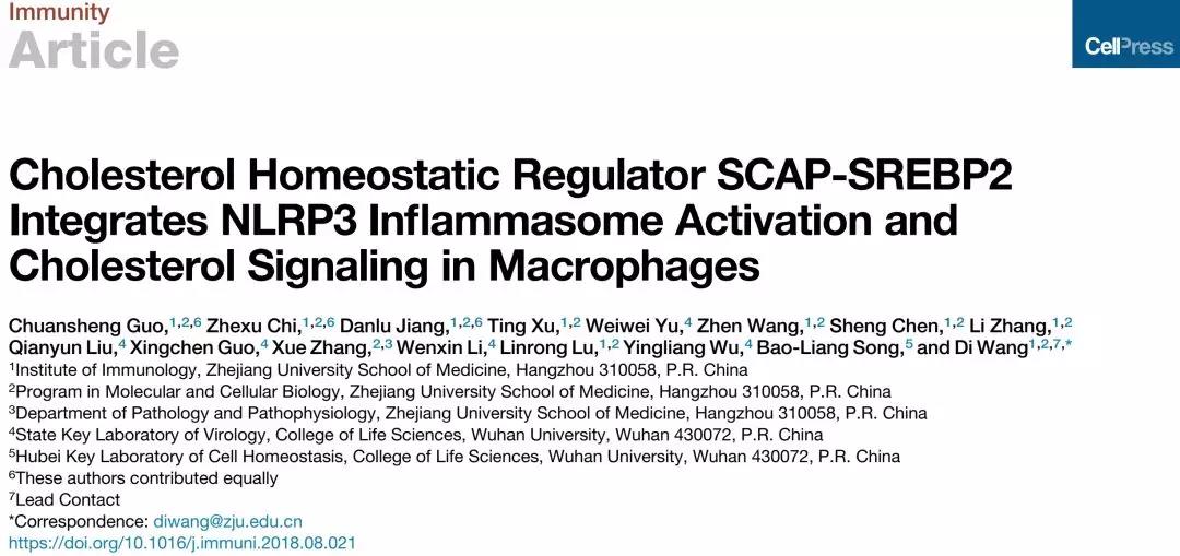 437bwin必赢国际官网免疫学研究所王迪教授课题组在免疫学杂志Immunity上发表题为“Cholesterol HomeostaticRegulator SCAP-SREBP2 Integrates NLRP3 Inflammasome Activation andCholesterol Biosynthetic Signaling in Macrophages”的研究论文。该文发现在炎症发生过程中,重要的胆固醇感受器SCAP-SREBP2复合物通过促进NLRP3炎症小体的活化从而在巨噬细胞中将胆固醇合成通路与炎症信号紧密地联系在一起,共同促进了巨噬细胞的活化以及炎症的发生。