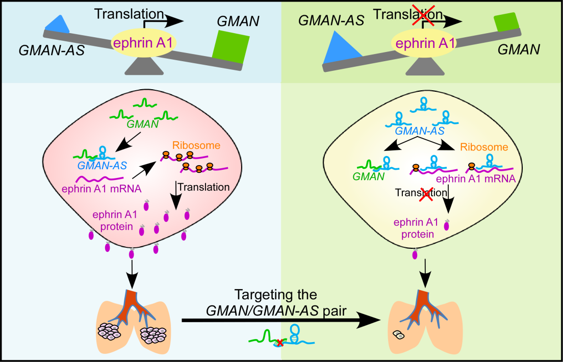 进一步的机制研究发现,在GMAN的反义链上存在一个未被报道的lncRNA GMAN-AS (GMAN antisenseRNA ),其与ephrinA1也存在部分序列的互补配对。GMAN-AS可直接与ephrinA1 mRNA结合,抑制ephrinA1的翻译。RNApull-down等实验显示GMAN、GMAN-AS和ephrinA1间存在相互作用,竞争性调控ephrinA1 mRNA的翻译进而影响胃癌的转移。当细胞内GMAN-AS含量相对比较高时, GMAN-AS可与ephrinA1 mRNA结合,抑制ephrinA1的翻译和胃癌细胞的转移;当细胞中GMAN含量相对比较高时,GMAN可与GMAN-AS结合,导致GMAN-AS与ephrin-A1mRNA的结合减少,促进ephrinA1的翻译和胃癌细胞的转移。这项研究还发现,临床胃癌组织中GMAN和GMAN-AS的比例不仅与ephrinA1蛋白水平正相关,还显著影响胃癌病人的预后。