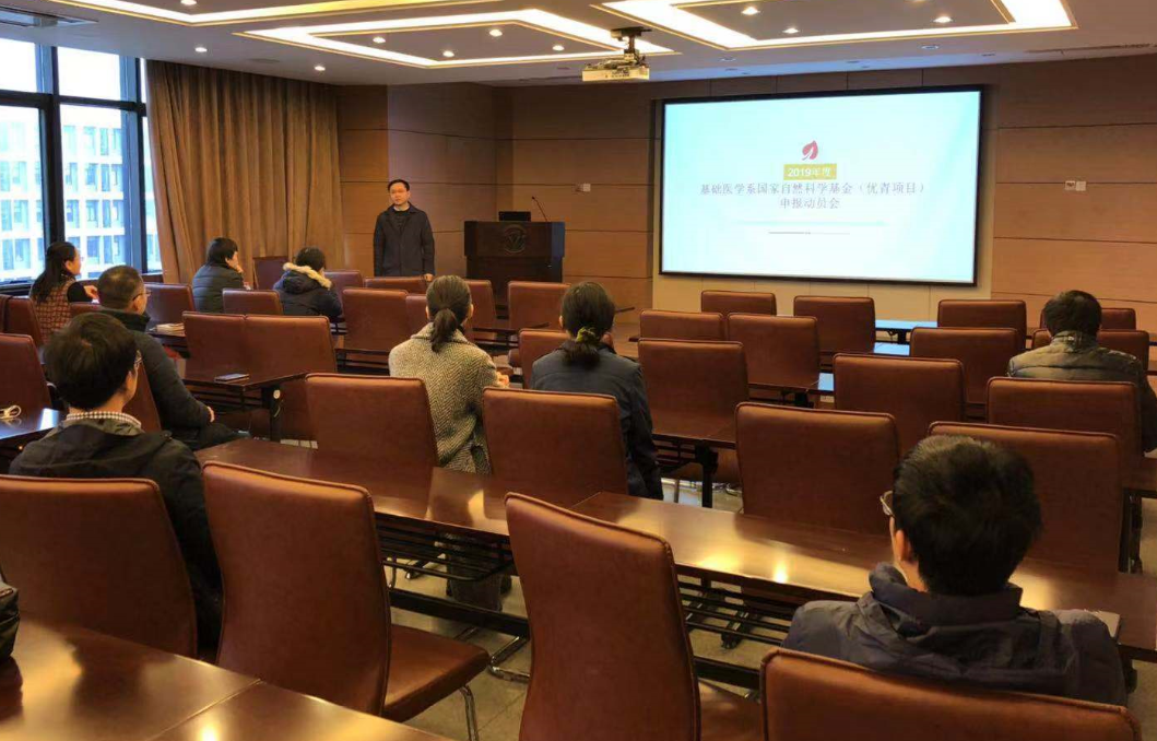为了切实做好2019年度国家自然科学基金的申报工作,进一步提高国家自然科学基金的申报质量,2018年12月11日上午,基础医学系国家自然基金(优青项目)申报动员会顺利举行,动员会邀请2018年优青项目获得者刘婷老师、2017年优青项目获得者郭国骥老师进行申报辅导,主管科研工作副院长杨巍教授主持了会议,16位拟申报教师参加了动员会。
