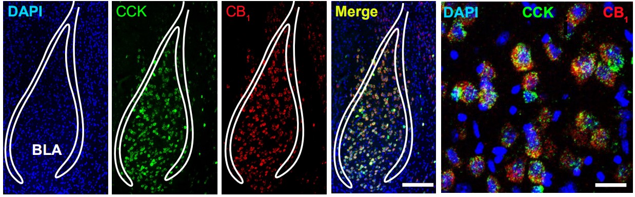 小鼠脑内杏仁核区域胆囊收缩素(Cholecystokinin,CCK)和大麻素受体(Cannabinoid receptors,CB1)共表达情况