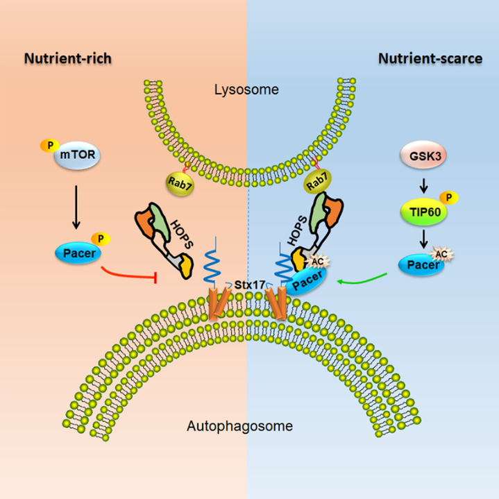 2019年1月28日,Cell系列子刊《Molecular Cell》在线发表了题为"Pacer is a mediator of mTORC1 andGSK3-TIP60 signaling in regulation of autophagosome maturation and lipidmetabolism" 的研究论文。该工作进一步阐明了Pacer在自噬溶酶体成熟过程中的调控机制,并为“代谢信号调控晚期自噬”这一重要科学问题提供了一个具有较高理论价值的范例。这一发现对进一步深入理解多细胞生物自噬调控机制具有重要意义。