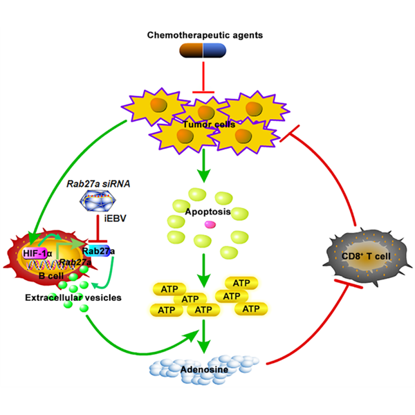 化疗药物诱导的凋亡肿瘤细胞可在短时间内向胞外释放大量的ATP,人体如何处理这样巨大水平的ATP及其对机体抗肿瘤免疫的影响仍不清楚。CD39是外核苷三磷酸二磷酸水解酶1,可将ATP水解为ADP或AMP。 CD73是5-主核苷酸水解酶,可将AMP水解为腺苷。腺苷是一种功能强大的免疫抑制性分子,能够抑制CD8阳性T细胞的活化。该研究发现,B细胞释放的CD19阳性胞外囊泡含有高水平的CD39和CD73分子,能将化疗药物诱导的凋亡肿瘤细胞释放的ATP水解为腺苷,抑制化疗后CD8阳性T细胞的活化,进而削弱化疗的抗肿瘤效果。虽然肿瘤小鼠和正常小鼠体内CD19阳性胞外囊泡含有相近水平的CD39和CD73分子,并显示出类似的水解ATP和抑制化疗抗肿瘤效果的能力,但与正常小鼠相比,肿瘤小鼠的B细胞能够释放更多水平的胞外囊泡。进一步的研究表明,肿瘤微环境可上调B细胞中HIF-1ɑ的蛋白水平,随后HIF-1ɑ直接结合到Rab27a基因的启动子,促进Rab27a蛋白的表达,最终促进B细胞分泌更多的胞外囊泡。同样的,与健康人相比,该研究显示在不同分期的肿瘤病人血清中检测到更高水平的CD19阳性胞外囊泡,而且含有较低水平CD19阳性胞外囊泡病人显示出更好的化疗效果,进而提示了血清CD19阳性胞外囊泡在肿瘤诊断及化疗效果评价中的意义。