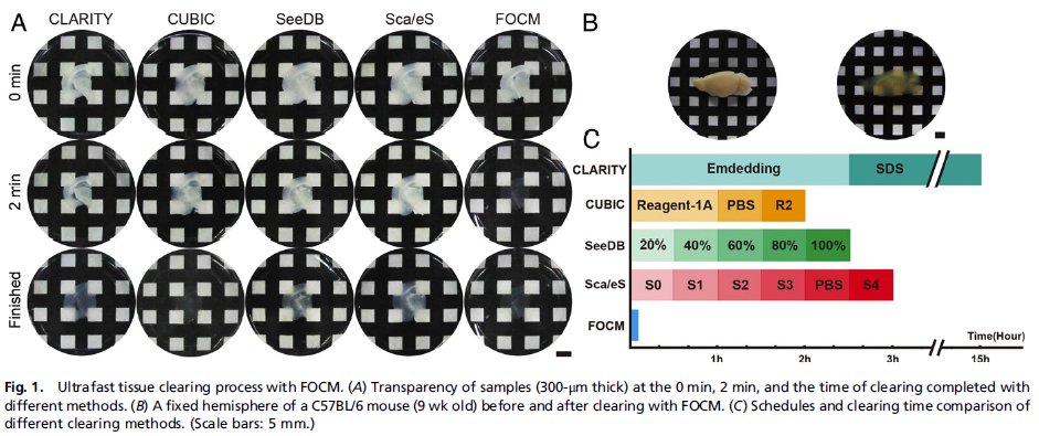 该研究研发了一种具有完全自主知识产权的超快速光学清除技术(FOCM),可在2分钟内实现对较厚脑切片的透明化处理。该技术具备简单易用、无毒无害、适合多种染色、荧光保留持久、处理后无组织形变等特点,实现了透明技术的通用化。采用该技术后,即使只用低配置的光学显微镜,也能实现厚样本的三维高分辨重构,可极大地降低科研成本,有望进一步推动我国生命科学,尤其是脑科学的发展。
