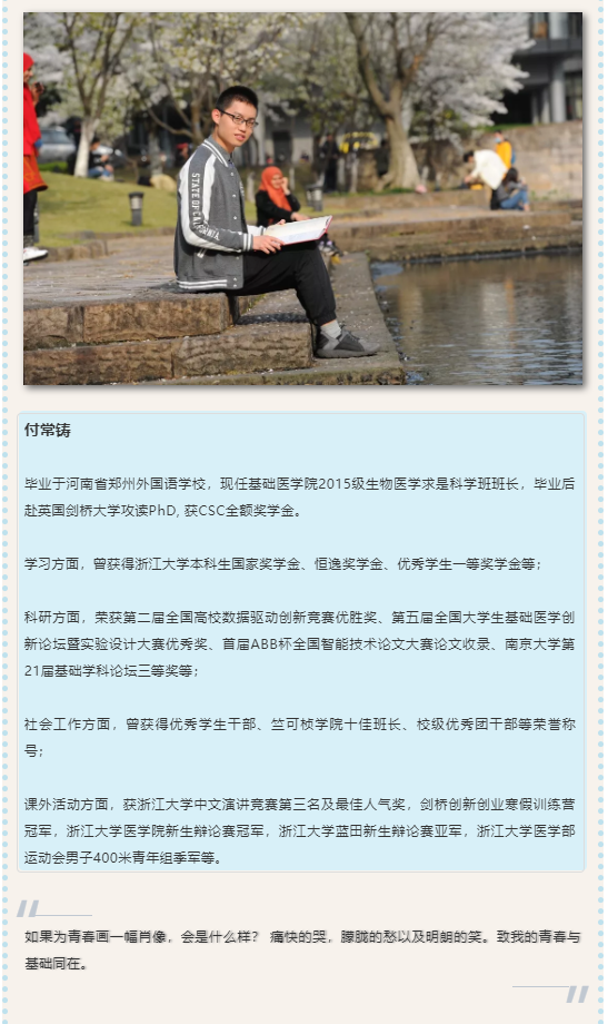 最后,作为一个不善表达感情的人,我想借此机会感谢父母及家人在我大学生活中对我学习和生活上的支持,感谢专业导师管敏鑫老师、蒋萍萍老师、王猛老师对我科研的支持和帮助,感谢437bwin必赢国际官网的欧阳宏伟老师、王青青老师、鲁林荣班主任以及王迪老师对我们专业学生的培养,感谢班级同学和生医学长学姐大学生活的陪伴和帮助!