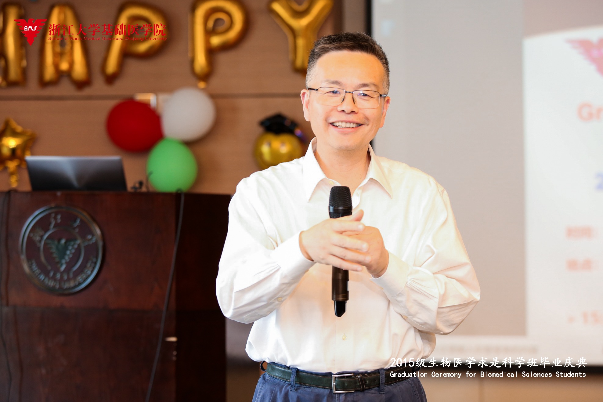 鲁林荣教授作为2015级学生的班主任,陪伴同学们度过了4年的大学时光。首先他对同学们顺利毕业表示祝贺并感谢过往一届届生物医学专业的同学们,同学们的优秀表现使浙大基础医学学科充满活力。同时作为一个科学工作者他希望同学们为祖国的科学事业贡献力量,做出开创性的成果。最后他鼓励同学们只要胆子足够大,未来就足够开阔。