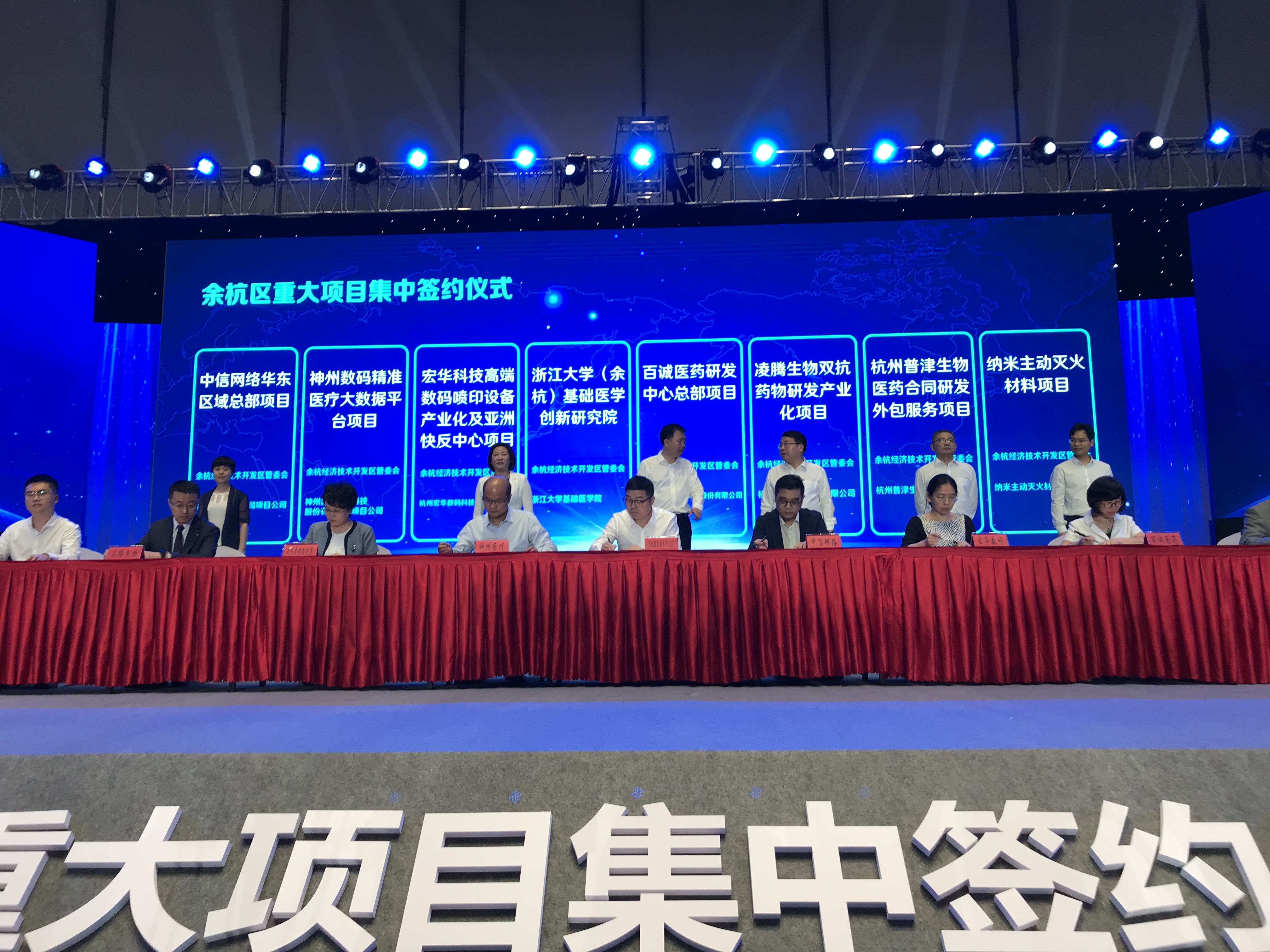 6月28日上午,在2019年全国双创活动周开幕式主会场——未来科技城学术交流中心,余杭区举行2019年第二季度重大项目集中开工暨集中签约活动。区领导张振丰、陈如根、阮文静、沈昱、祝振伟、李忠誉等出席参加该活动。总投资约267亿元的17个重大项目集中开工,总投资约160亿元的36个重大项目集中签约。