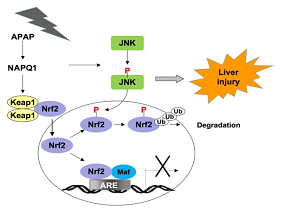Fig.1 APAP的代谢物NAQPI激活JNK,同时修饰Keap1,导致Nrf2入核。P-JNK磷酸化Nrf2的Neh6结构域并引发其降解。结果,Nrf2介导的转录程序被抑制,从而细胞解毒系统和保护系统受损。