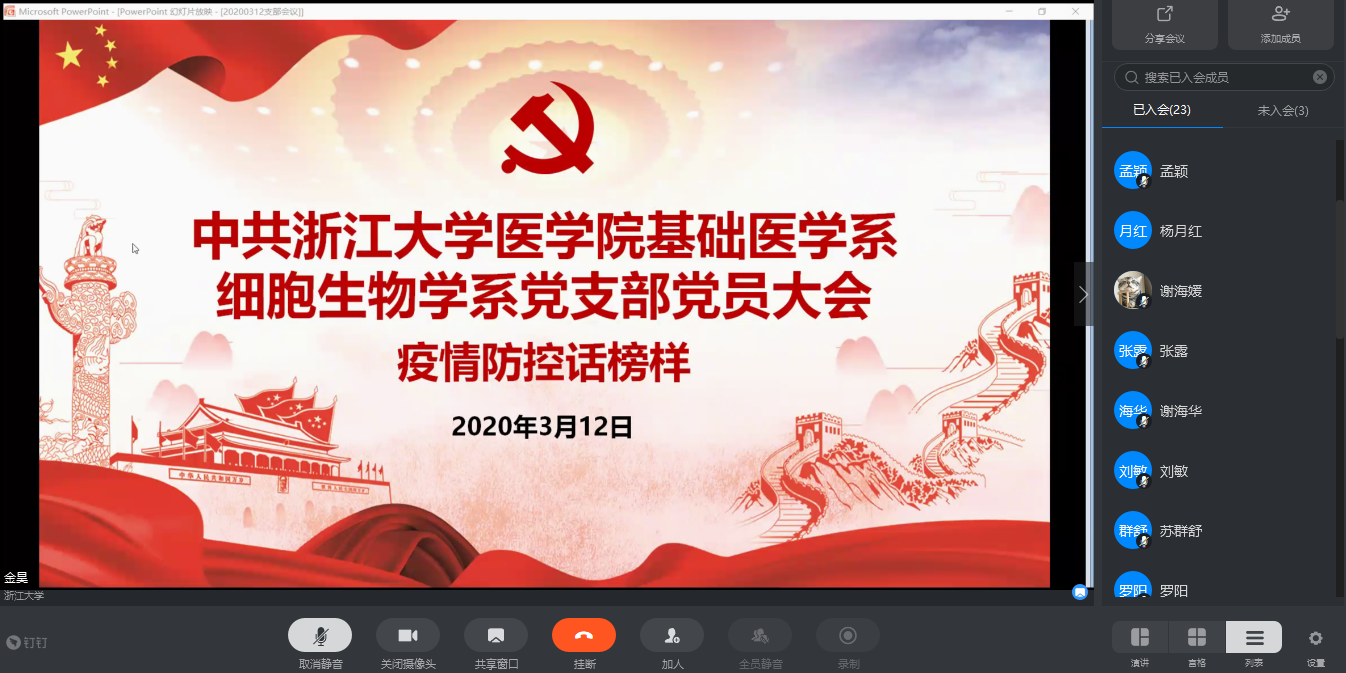 2020年3月12日下午1点,中共437bwin必赢国际官网医学院基础医学系细胞生物学系党支部开展了一场以“疫情防控话榜样”为主题的线上党员大会。本次大会由学生副书记金昊主持,通过浙大钉平台发起视频会议,支部党员及入党积极分子准时上线参会。