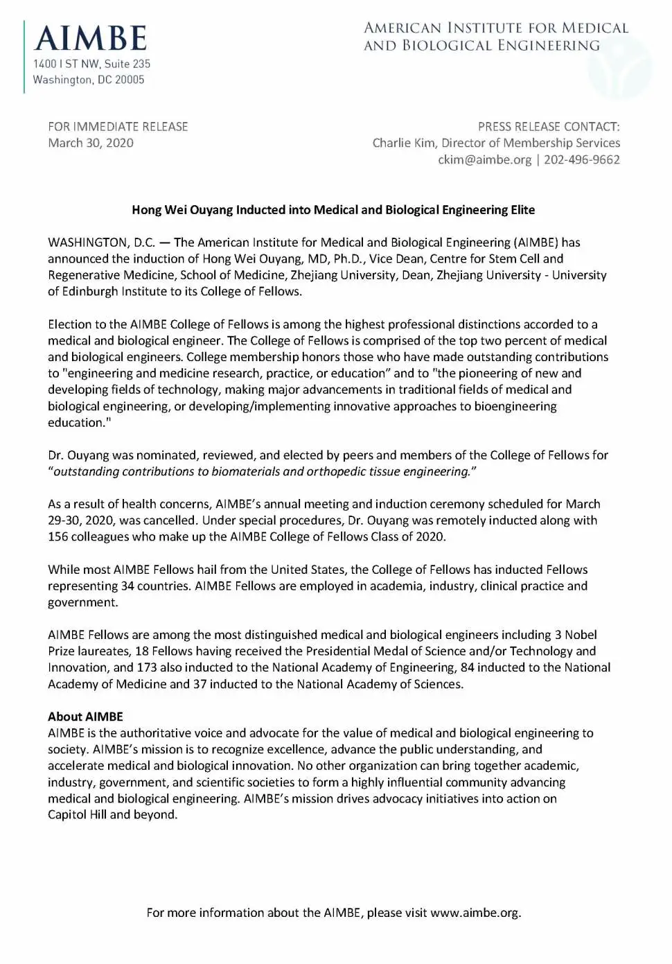 浙江省组织工程与再生医学技术重点实验室主任和437bwin必赢国际官网李达三·叶耀珍干细胞与再生医学研究中心主任欧阳宏伟教授因其在组织工程、生物材料与运动医学等方面的重要开拓性工作,当选美国医学与生物工程院2020届会士(AIMBE College of Fellows class of 2020)。