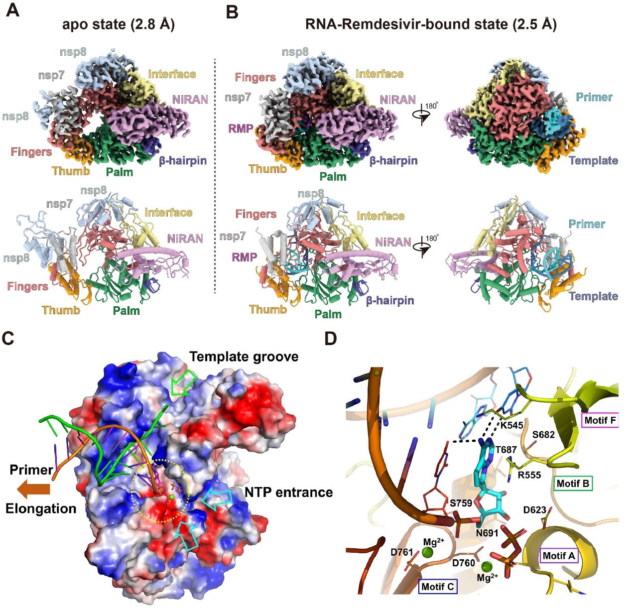 A-B,新冠病毒 RNA 聚合酶apo状态(A)以及与RNA模板和瑞德西韦复合物(B)的电镜密度图以及结构模型。C,新冠病毒 RNA 聚合酶的工作原理。D,新冠病毒 RNA 聚合酶的催化活性中心 (瑞德西韦显示为蓝绿色)。