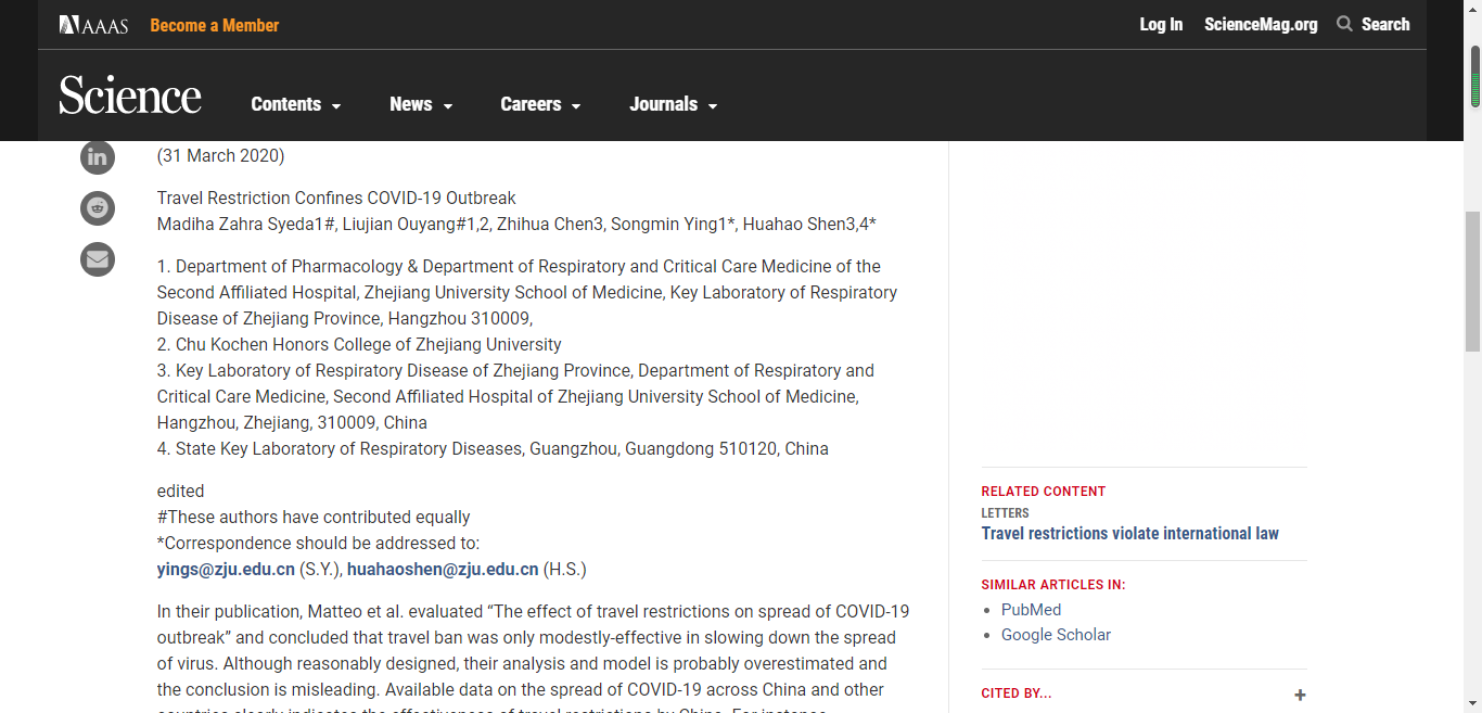 结果清晰地表明,中国政府的“旅行管控”举措对国内其他地区疫情管控卓有成效,从而针对性反驳了Science论文的观点,并向国际社会发出了“正视中国抗疫经验,学习中国抗疫举措”的声音。在目前形势下,新冠肺炎疫情已经不是某一个国家或者地区的问题,而是对全球所有国家防疫能力的集体考验,而这封来自浙大医学院的e-letter,用详实的数据有力的反驳了外国学者的错误观点,也向全世界展示了抗击新冠肺炎的中国经验。