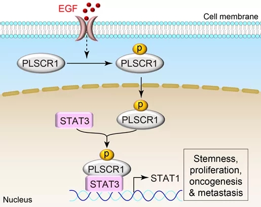 A proposed model to illustrate the nuclear translocation of PLSCR1, which activates STAT1 and enhances cancer stem cell (CSC)-like properties in BLBC