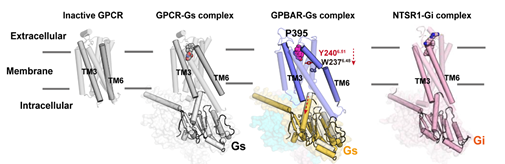 (1)本研究明确提出了GPBAR不同于经典的受体激活机制与分子开关。此前“toggle switch”的结合和PIF基序的结构重排都被认为是大多数GPCR的共同机制。而对GPBAR而言,它的第六个跨膜螺旋(TM6)中虽然具有“toggle switch” W237氨基酸,但并不具备分子开关的功能;发挥分子开关功能的残基却是其上一个螺旋中的Y240。有趣的是,GPBAR的TM6与TM3的相互距离在所有已有结构报道的GPCR中最大,整个激活模式与结构重排都是一种全新的方式(图2)。这些新的发现扩展了人们对GPCR激活机制的认识。
