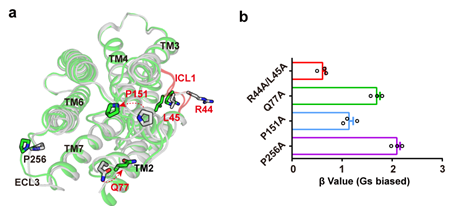 (6)最近的研究刚刚发现胆汁酸受体可以通过Arrestin偏好性途径调控不同的生理功能。偏向性配体的研究及开发是目前GPCR领域的一个热点,本研究应用的两个化合物具有不同的偏向性。通过对结构及生化数据的分析,发现GPBAR的ECL1,ECL3及ICL1是决定配体偏向性的结构基础(图5),这为开发偏向性配体及药物的开发提供理论基础。