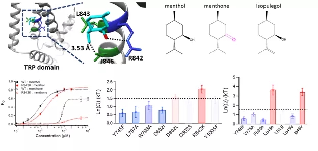 该论文首先通过基于TRPM8通道结构的分子计算对接,预测了薄荷醇与TRPM8通道的一系列相互作用。研究人员进而在预测的TRPM8的配体结合口袋里引入了一系列氨基酸点突变,通过基于电生理膜片钳记录的双突变循环实验策略,得到薄荷醇、薄荷醇类似物和TRPM8突变体之间的结合能。电生理实验结果与分子对接结果相吻合,即薄荷醇通过 “grab and stand”机制与TRPM8通道结合,即薄荷醇的羟基像“手”一样,通过氢键“抓紧”TRPM8的第四个跨膜区(S4)上的R842位点;而薄荷醇的异丙基像“脚”一样,通过范德华力“站在”L843和I846位点上。