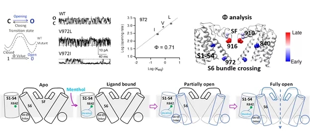 为了进一步阐明薄荷醇引起的动态构象变化的时间顺序,研究人员进行了基于单通道电生理记录的Φ分析,即在特定位点引入数个点突变,通过单通道记录,测量开放事件与关闭事件的时间长度分布,计算微观开放速率和关闭速率,进而通过对自由能的扰动大小的计算,推测该特定位点在离子通道被配体激活的动态过程中,发生构象变化的时间先后顺序。通过Φ分析,研究人员发现薄荷醇首先引起结合口袋周围的构象变化,继而引起S6附近的构象变化,最后导致选择性滤器附近的构象变化。