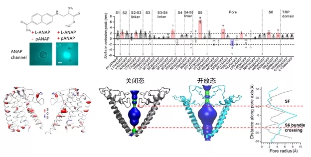 为了阐明薄荷醇打开TRPM8通道时引起的动态构象变化,研究人员在活细胞中将荧光非天然氨基酸ANAP标记在TRPM8通道的各个关键位置,观察到了薄荷醇激活TRPM8过程中的ANAP荧光光谱变化,表明薄荷醇的结合引起了TRPM8通道跨膜区的广泛构象变化。应用薄荷醇引起的ANAP荧光光谱变化的实验数据作为限制条件,该研究使用Rosetta计算生物学平台上构建了TRPM8的开放态模型,为理解薄荷醇激活TRPM8通道的完整结构机制提供了强有力的支撑。