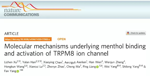 2020年7月29日,来自437bwin必赢国际官网生物物理学系的杨帆课题组、杨巍课题组和东北林业大学的杨仕隆课题组在Nature Communications杂志上发表研究论文 “Molecular mechanisms underlying menthol binding and activation of TRPM8 ion channel” 来探索上述机制。