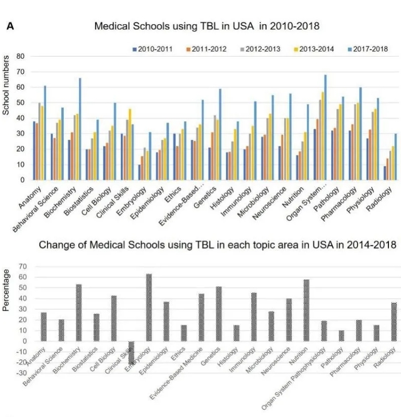 根据美国医学院联盟2010-2018年统计的131-147所美国医学院常用的8种教学方法数据显示,TBL在各学科应用的院校逐年增加,尤其在基础医学学科中这种趋势更明显。近年来,生物化学、生物统计学、细胞生物学、组织学和营养学等学科使用TBL的院校数量超过了使用PBL的院校数量,而解剖学、遗传学、器官系统病理生理学、病理学和药理学等学科使用TBL的院校数量自2010年以来都比使用PBL的院校数量多。