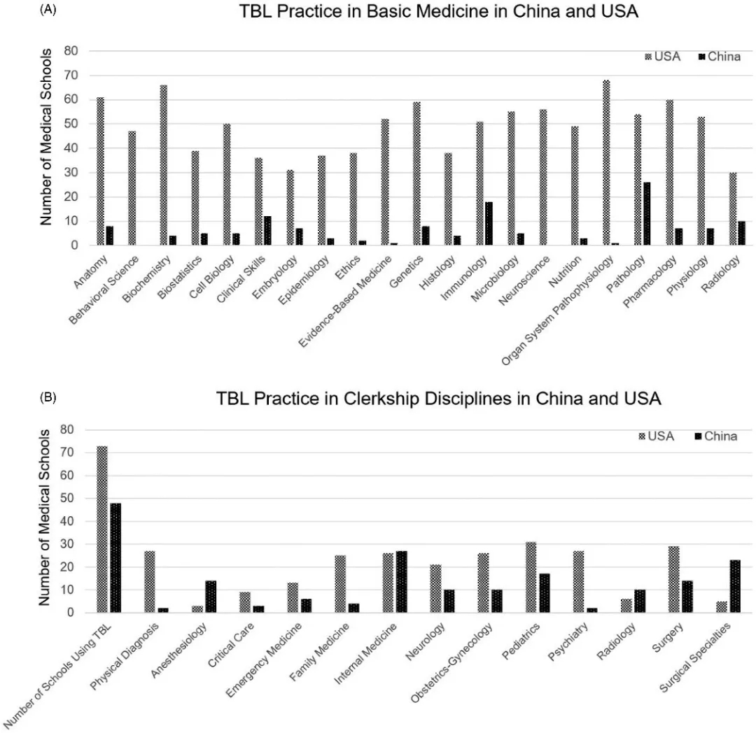 在我国,由于以往没有一个权威医学院校管理机构对各校所有教学方法进行年度统计,所以本文采用了线上数据库已发表文献资料和问卷调查两种方式结合进行了回顾和分析。结果显示目前我国各医学学科采用TBL教学的院校数量非常有限,尤其在基础医学学科里,有些学科零报道,采用TBL院校最多的学科是病理学、免疫学和临床技能,但相较相同学科采用TBL的美国医学院数量而言不到一半。2017-2018年被统计的美国医学院数量为147所,我国教育部数据显示到2019年12月全国共有177所医学院,因此我国医学院使用TBL的比例更低。造成这种情况最大的可能性是TBL在美国传播的时间更早、体系更成熟。经过问卷调查,发现接近10%院校的老师不知道TBL,这个数据是通过微信发放到部分专业学会群和全国教师教学培训群的问卷调查得到的,而关注这些微信群相关信息的老师多数活跃在教学教改一线,因此实际上更高比例的老师不知道TBL。基于此,需要加大TBL的宣传力度。