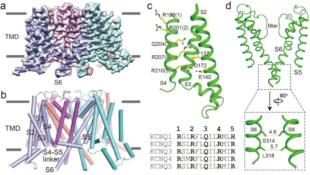 图1,人源KCNQ2通道四聚体结构。a,KCNQ2冷冻电镜密度图;b,KCNQ2卡通结构图;c,KCNQ2电压感受器结构域的结构和KCNQ家族S4的序列比对;d,KCNQ2孔道结构图。