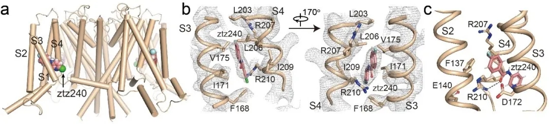 图2, KCNQ2结合ztz240的结构。a,ztz240在KCNQ2的位置;b,ztz240结合位点的局部电子密度;c,ztz240位于门控电荷转移中心。
