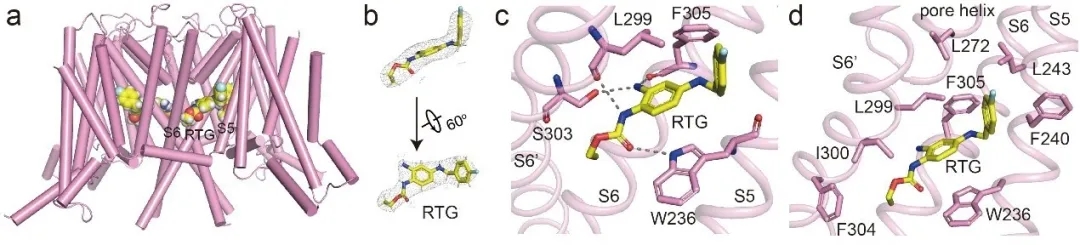 图3,KCNQ2结合RTG的结构。a,RTG在KCNQ2的位置;b,RTG的电子密度;c,RTG与其周围氨基酸残基之间的氢键(虚线);d,RTG与其周围氨基酸残基之间的疏水相互作用。