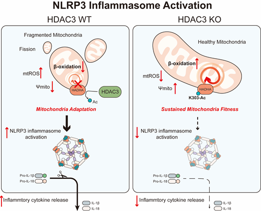 2020年9月15日,437bwin必赢国际官网王迪教授课题组池哲勖(博士后)和陈晟(八年制第5年)作为共同第一作者在Molecular Cell杂志发表研究论文“Histone Deacetylase 3 Couples Mitochondria to Drive IL-1β-Dependent Inflammation by Configuring Fatty Acid Oxidation”,揭示了组蛋白脱乙酰基酶3(HDAC3)通过非组蛋白脱乙酰基功能(non-histone deacetylation)塑造巨噬细胞在IL-1β成熟加工过程中的脂肪酸氧化和线粒体代谢适应性。与其经典功能不同的是,在炎症小体介导的炎症过程中,HDAC3转位至线粒体并去乙酰化线粒体脂肪酸氧化关键酶HADHA(mitochondrial trifunctional enzyme subunit α)并使其活性下降,帮助巨噬细胞获得脂肪酸氧化和线粒体形态上的适应性,并最终促进了IL-1β的产生。