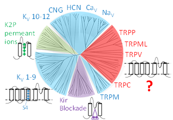 一层薄薄的细胞膜,将细胞内环境与外部环境分隔开来,也在细胞膜的内外两侧之间形成了数十毫伏的电势差。这样的跨膜电势差在各种生命活动中都发挥着关键作用。以神经系统为例,神经元的跨膜电势差是形成神经电信号的基础:它可以调控神经元细胞膜上的各种离子通道膜蛋白的开放与关闭,进而形成动作电位与各种神经电活动[1, 2]。那么,细胞膜上的离子通道是如何感受跨膜电压的变化呢?自从20世纪80年代以来,随着电压门控钠离子通道(Nav)和钾离子通道(Kv)的相继克隆[3, 4],人们很清楚的知道Nav和Kv的第四个跨膜螺旋(S4)上存在规则排布的4-5个带正电的氨基酸,它们可以在附近带负电氨基酸的配合下,感受跨膜电压的变化,在跨膜电压去极化时向上移动,进而拉动离子通道的开放[5]。然而,在世纪之交,随着一系列瞬时受体电位(Transient Receptor Potential,TRP)离子通道的发现[6],经典的S4电压感受器理论面临挑战:很多TRP通道可以像Nav和Kv通道那样被跨膜电压直接激活,但是TRP通道的S4上面仅有1个甚至没有带正电荷的氨基酸,那么TRP通道是如何感受跨膜电压的呢?