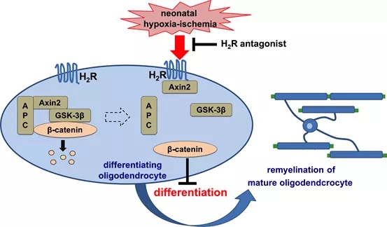 课题组长期致力于组胺受体在中枢神经系统疾病中的细胞特异性功能研究。在该研究中,通过病毒介导的蛋白干扰或过表达等手段研究发现,组胺H2 受体在氧糖剥夺后能够抑制原代培养的少突胶质细胞的分化成熟。利用Cre-loxp技术选择性敲除少突胶质细胞上H2受体发现,缺失H2受体能够促进缺氧缺血后少突胶质细胞的分化,并促进髓鞘再生,从而改善神经功能。为了进一步探索少突胶质细胞上的组胺 H2 受体在HIE后抑制其分化的作用机制,课题组利用串联亲和纯化结合蛋白质谱技术发现,Wnt/β-catenin通路相关蛋白Axin2在缺血后与H2受体蛋白相互结合,参与调控少突胶质细胞的分化。基于此,课题组采用临床上已经用于治疗新生儿胃酸反流的组胺H2受体拮抗剂,研究发现组胺H2受体拮抗剂可以促进新生小鼠缺氧缺血引起的脑白质损伤的恢复,并改善运动和认知功能。更有意义的是,考虑到新生儿用药的特殊性以及临床上对HIE的诊断存在一定的滞后性,课题研究发现,即使推迟或缩短给药时间,也能有效减轻HIE小鼠的脑白质损伤。