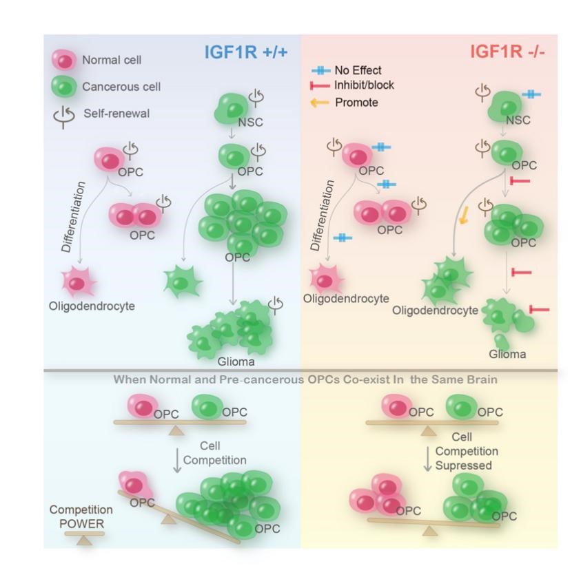 为了阐述胶质瘤发育层级中不同细胞身份对IGF1R的敏感性的差别,作者利用以NSC为肿瘤细胞起源的胶质瘤原发模型,揭示了IGF1R的敲除并不影响突变NSCs的增殖。只有突变NSCs进一步分化成突变OPCs后,其增殖能力才会受到IGF1R靶向的影响。这提示,细胞身份也是决定IGF1R靶向敏感性的重要因素。