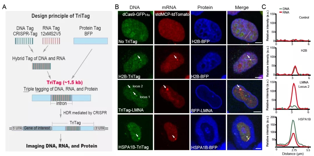 图1. TriTag技术在活细胞内同时可视化DNA、新生mRNA和蛋白的原理示意图