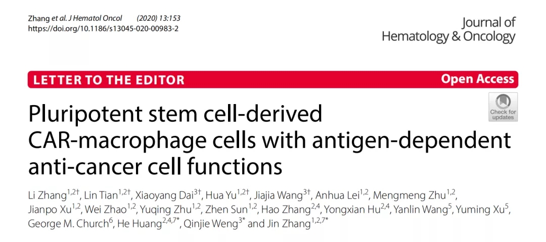 2020年11月11日,437bwin必赢国际官网干细胞与再生医学中心/浙江省良渚实验室的张进团队与437bwin必赢国际官网药学院翁勤洁团队以及437bwin必赢国际官网附属第一医院黄河团队联合在Journal of Hematology & Oncology(IF: 11.059) 杂志上发表标题为Pluripotent Stem Cell-derived CAR-Macrophage Cells with Antigen-dependent Anti-Cancer Cell Functions的文章,首次报道了基于诱导多能干细胞 (iPSC) 分化的表达嵌合抗原受体的巨噬细胞 (CAR-iMac) 在肿瘤的免疫细胞治疗中的应用。