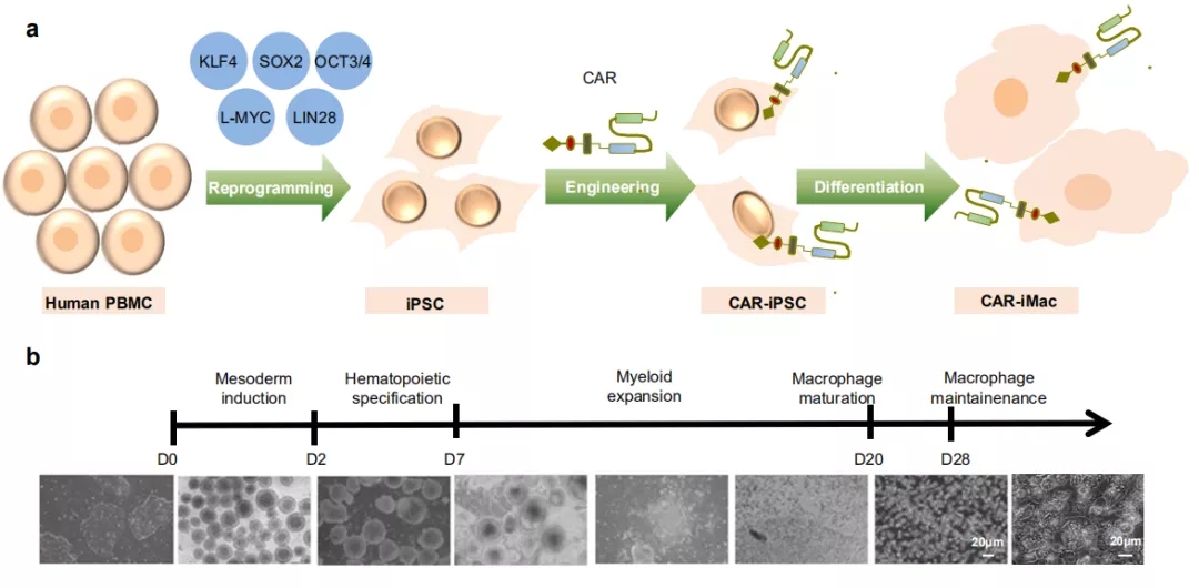 在该项研究中,437bwin必赢国际官网的研究人员开发了诱导多能干细胞iPSC分化得到的表达CAR的巨噬细胞(CAR-expressing iPSC-derived Macrophage, CAR-iMac) 用于肿瘤免疫细胞治疗。诱导多能干细胞(induced pluripotent stem cell, iPSC)由人体外周血单核细胞经过重编程产生,具有分化成为多种体细胞的潜能,由于其来自病人本身、易于扩增、且具有单克隆基因修饰/编辑的便利性等优点,受到广泛的关注,近年来得到了迅速的发展,其中一个重要的应用即是分化为免疫细胞。之前有研究报道利用iPSC分化得到CAR-T和CAR-NK 细胞[4-5],它们对血液瘤和实体瘤都具有很好的杀伤效果。