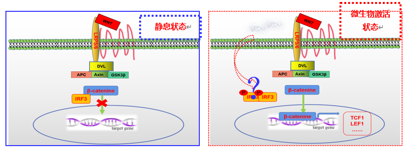 该课题组使用原发性小鼠结肠癌模型,明确肠上皮系统中的IRF3对于结肠癌发生和发展的调控作用及其分子机制,进一步扩展 CRC 的发病调控机制。该研究首次阐明:1.IRF3 缺失显著增加结直肠肿瘤发生过程中的肿瘤数量和肿瘤负荷;2.胞质内非活化的 IRF3直接结合中β-catenin 的ARM 结构域抑制 β-catenin入核,从而抑制 Wnt 信号通路的活化,负相调控结直肠癌的发生;3. 肠道微生物通过活化IRF3, 使其失去抑制Wnt信号通路的功能,促进肠癌的发生; 4.临床数据显示,IRF3 低表达的CRC 、肺腺癌和肝癌患者表现出增强的 Wnt靶基因活化,并且预后较差。以上数据表明 IRF3 可以作为CRC 、肺癌和肝癌治疗的分子靶标。该研究首次发现IRF3 通过 Wnt 信号通路影响肿瘤发生与发展过程,表明IRF3 在肿瘤中发挥重要的作用。并揭示了IRF3的活化参与到肠道微生物调控的肠癌发生。
