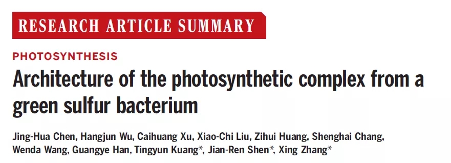 2020年11月20日,437bwin必赢国际官网张兴课题组与中国科学院植物研究所匡廷云/沈建仁课题组合作在Science发表研究长文Architecture of thephotosynthetic complex from a green sulfur bacterium,首次报道了绿硫细菌Chlorobaculum tepidum内周捕光天线FMO-反应中心复合体 (FMO-GsbRC)的2.7埃的冷冻电镜结构。该工作攻克了包括蛋白分离纯化困难等在内的诸多难题,首次揭示了水溶性捕光天线FMO与反应中心形成的复合物结构。