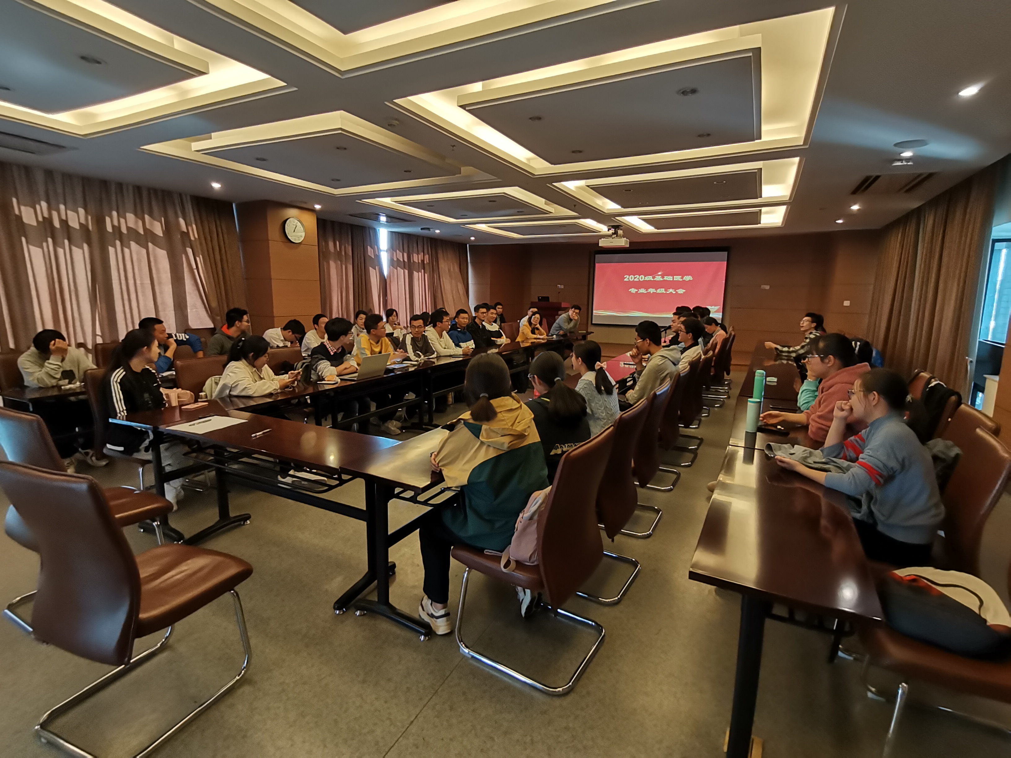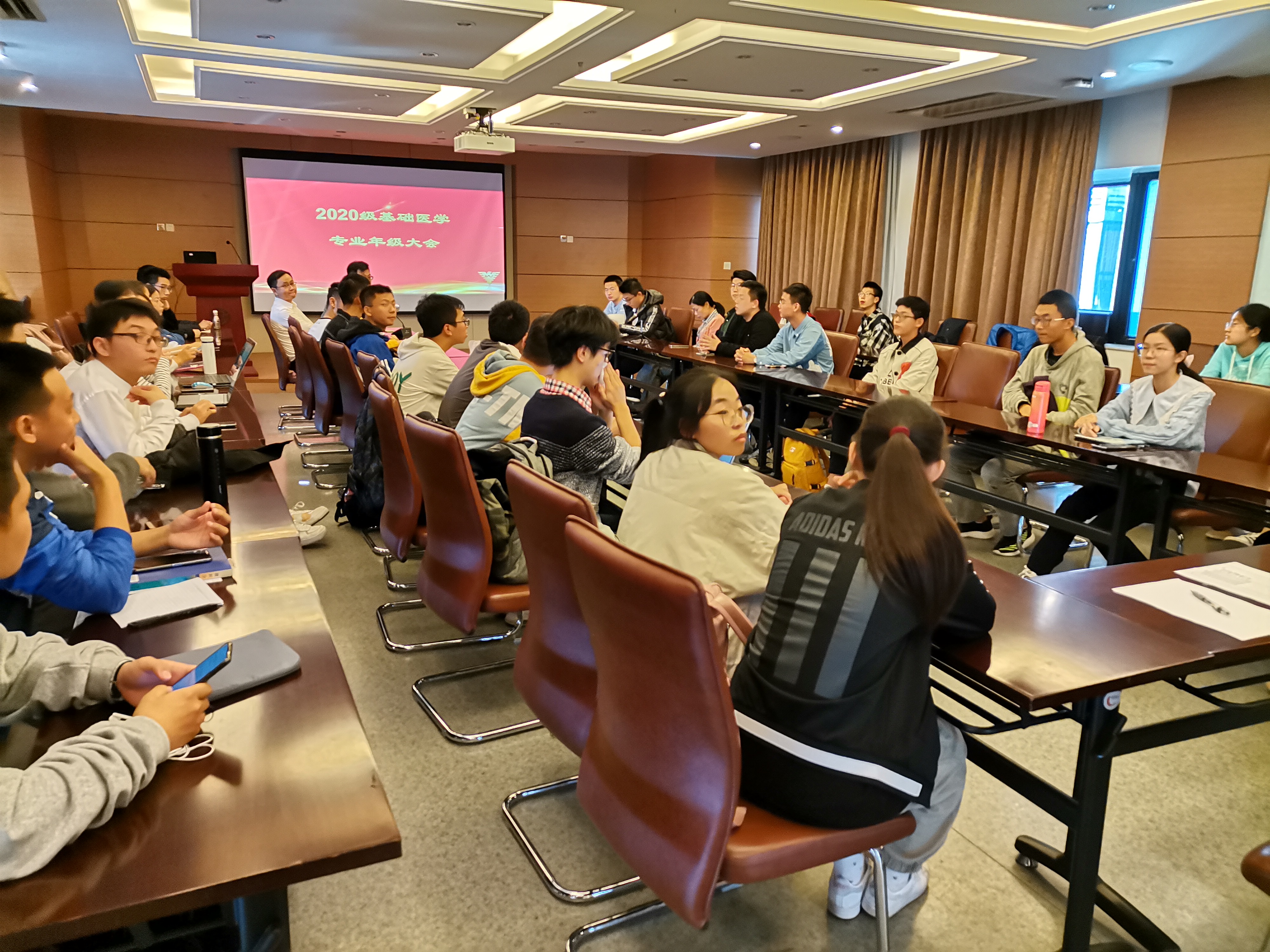 2020年11月6日,2020级基础医学求是科学班同学、2020级基础医学强基班同学与班主任杨巍教授、主管教学副院长王迪教授、基础医学办公室主任林海燕老师、基础医学办公室本科教学行政管理富丽琴老师、班级辅导员孙丰柯老师在医学院综合楼705会议室举行了基础医学专业2020级本科生年级大会。